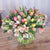 This vase contains 40 mix color Tulips and Alstrameria with eucaliptus